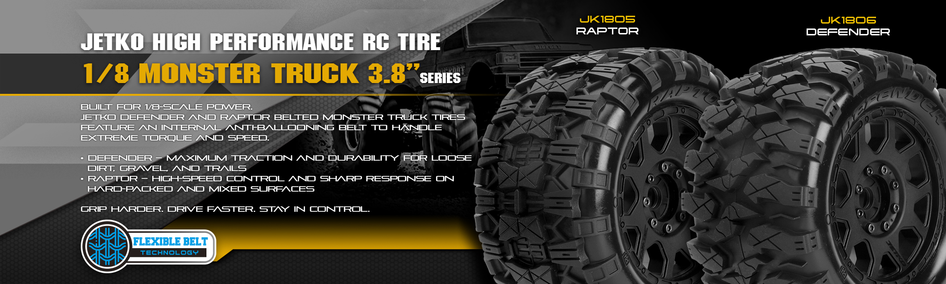 Jetko Defender and Raptor belted Monster Truck tires feature an internal anti-ballooning belt to handle extreme torque and speed.